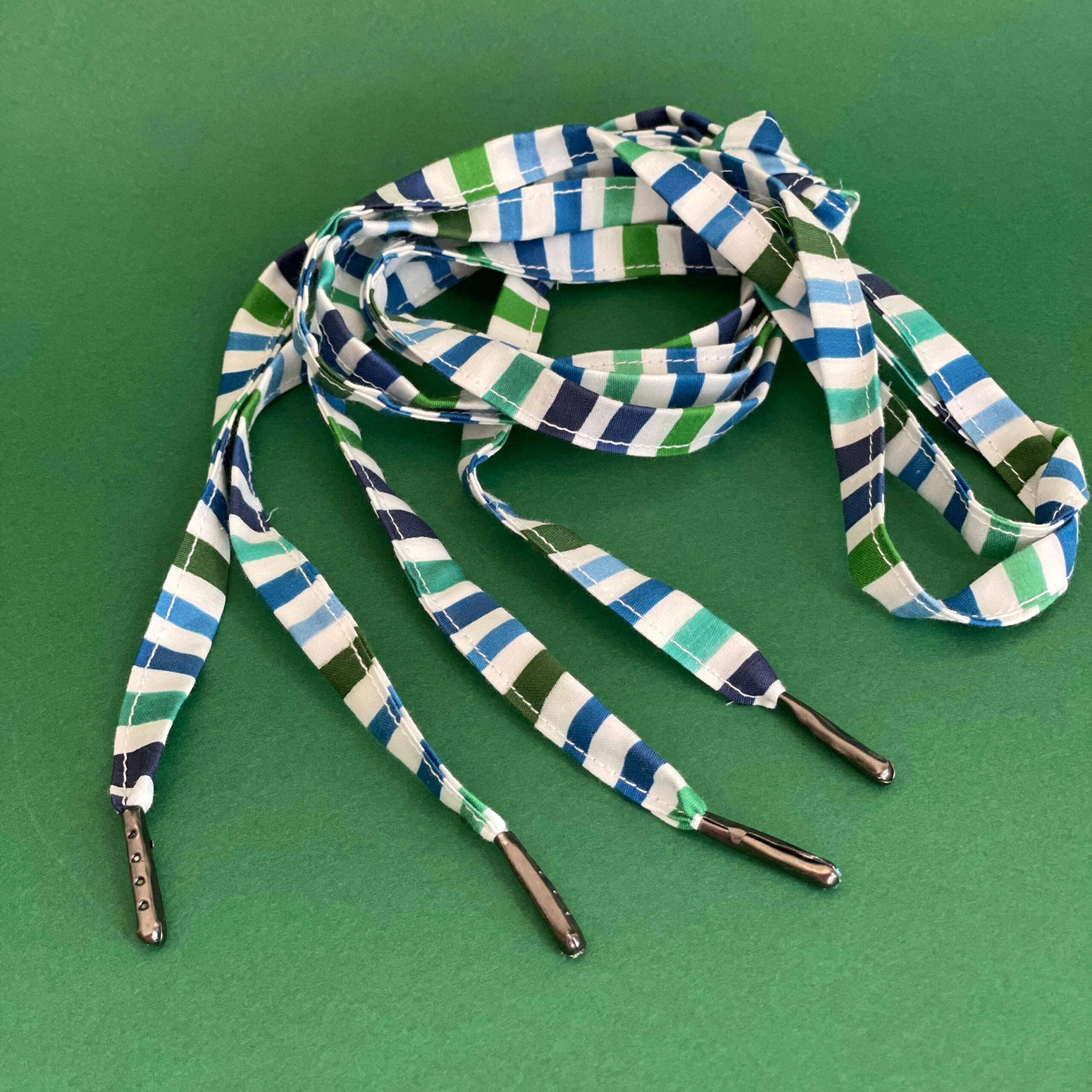 Chaque paire de lacets a été soigneusement préparée puis cousue à la machine. Ces lacets sont créés à partir des tissus joyeux et colorés de Carole Rampinetta ! Des embouts métalliques sont ajoutés pour de jolies finitions !