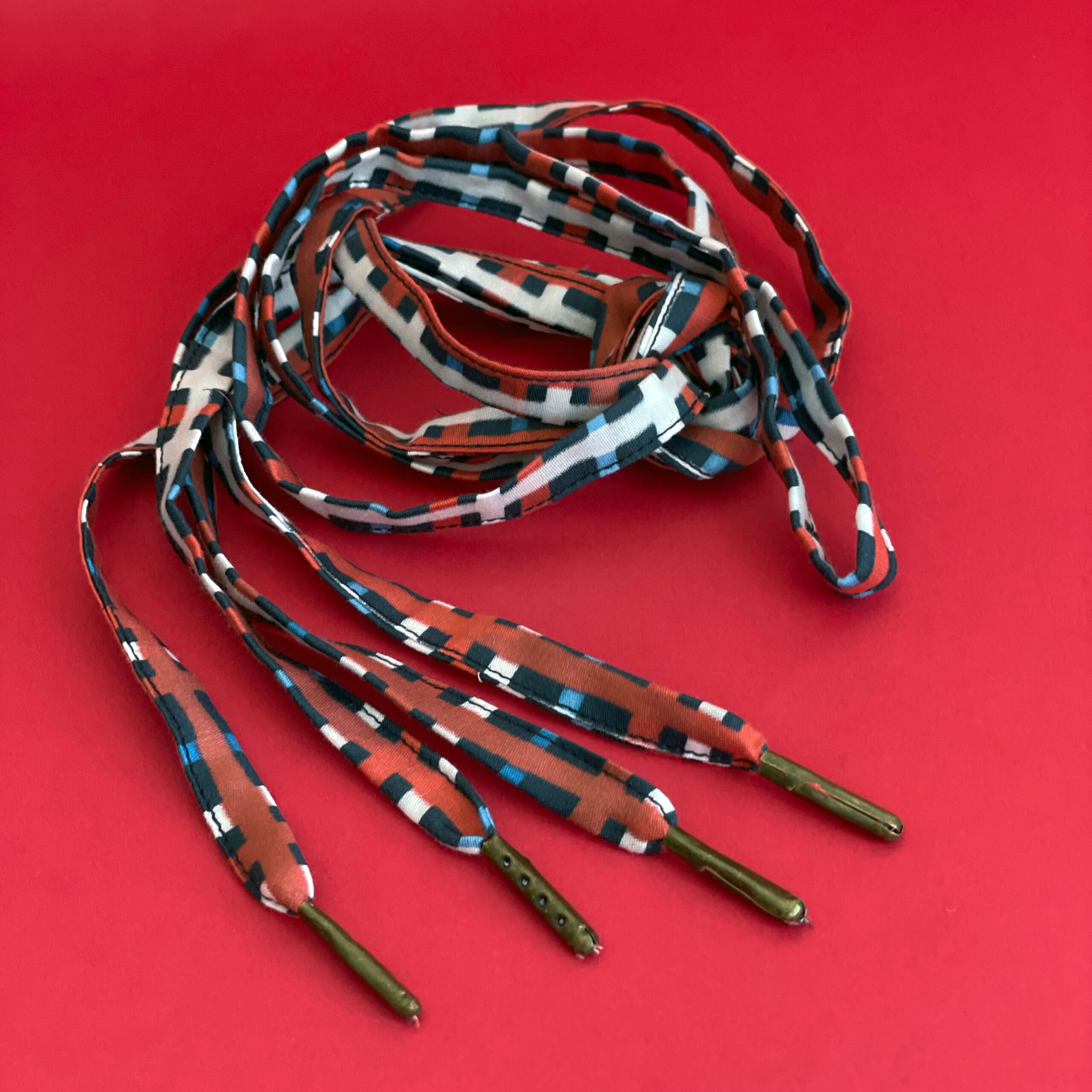 Chaque paire de lacets a été soigneusement préparée puis cousue à la machine. Ces lacets sont créés à partir des tissus joyeux et colorés de Carole Rampinetta ! Des embouts métalliques sont ajoutés pour de jolies finitions !